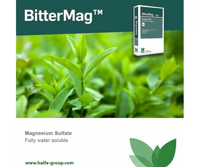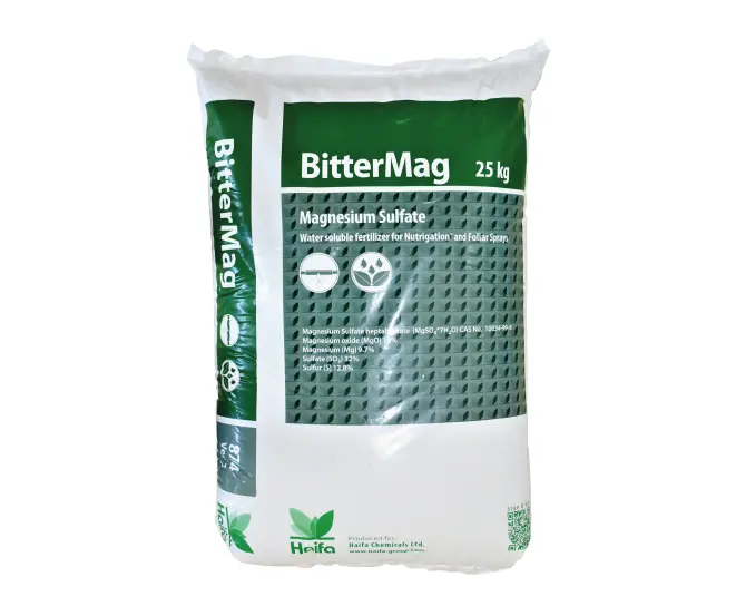 Îngrășământ pentru fertilizare atât radiculară cât și foliară Avantaje:– complet solubil– poate fi asimilat atât radicular cât și foliar– reacție acidă în soluție apoasă– poate fi amestecat cu alte îngrășăminte solubile în apă, cu excepția celor care conțin calciu și fosfor– intensifică activitatea fotosintetică a planteiMOD DE ACŢIUNEBitterMag este sulfat de magneziu solubil în apă în formă cristalină. Puritatea ridicată asigură o performanță remarcabilă atât în fertilizare cât și în tratamente foliare. BitterMag este important în faza de creștere a plantelor și imediat după înflorire, și anume în perioade deosebit de critice de lipsa de magneziuMOD DE APLICAREFertirigare: 10-25 kg/ha per aplicare nedepășind concentrația de 0,1-0,2% în soluția nutritivăFoliar: Doza medie este de 0,5-1% cu cele mai mici doze pe frunzele tinere și în amestecuri cu alte produse în timp ce cele mai mari în cazul deficiențelor de magneziu și/sau pe frunzele mature/culturi tolerante.