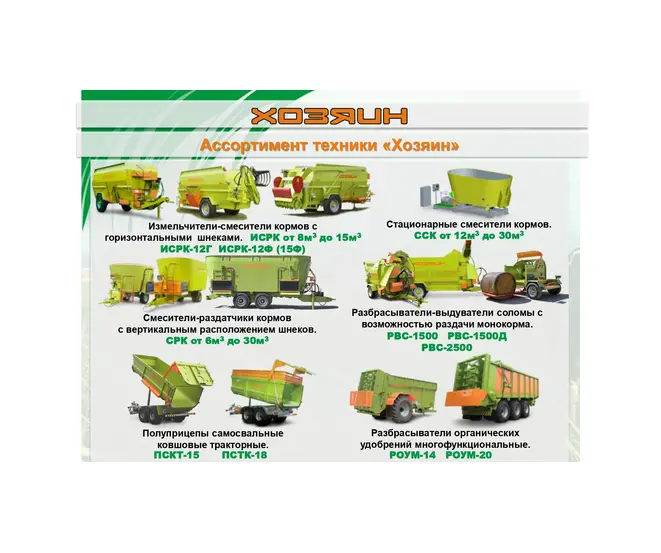 Техника и оборудование торговой марки «ХОЗЯИН»:•кормораздатчики с горизонтальным и вертикальным расположением шнеков;•раздатчики-выдуватели соломы для подстилки крупному рогатому скоту;•разбрасыватели твердых и жидких органических удобрений;•разбрасыватели минеральных удобрений;•полуприцепы для перевозки сельскохозяйственных грузов;•полуприцепы бункеры-перегрузчики зерна.